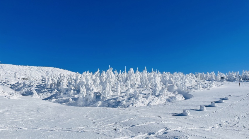 当初計画では10日は温泉に入って宴会して寝るだけの予定で、11日に蔵王温泉スキー場のロープウェイを利用して、地蔵岳直下からスノーモンスター巡りをする予定でしたが、11日は暴風雪の悪天予報のため、比較的天気予報が良い10日に、リフト乗車が混雑しない蔵王ライザワールドスキー場のリフトを利用して、刈田リフト下付近まで歩いてスノーモンスター巡りをする計画に変更したところ、快晴無風という予想外の好天に恵まれ、青空に映えるスノーモンスターとじっくり戯れることができました。
